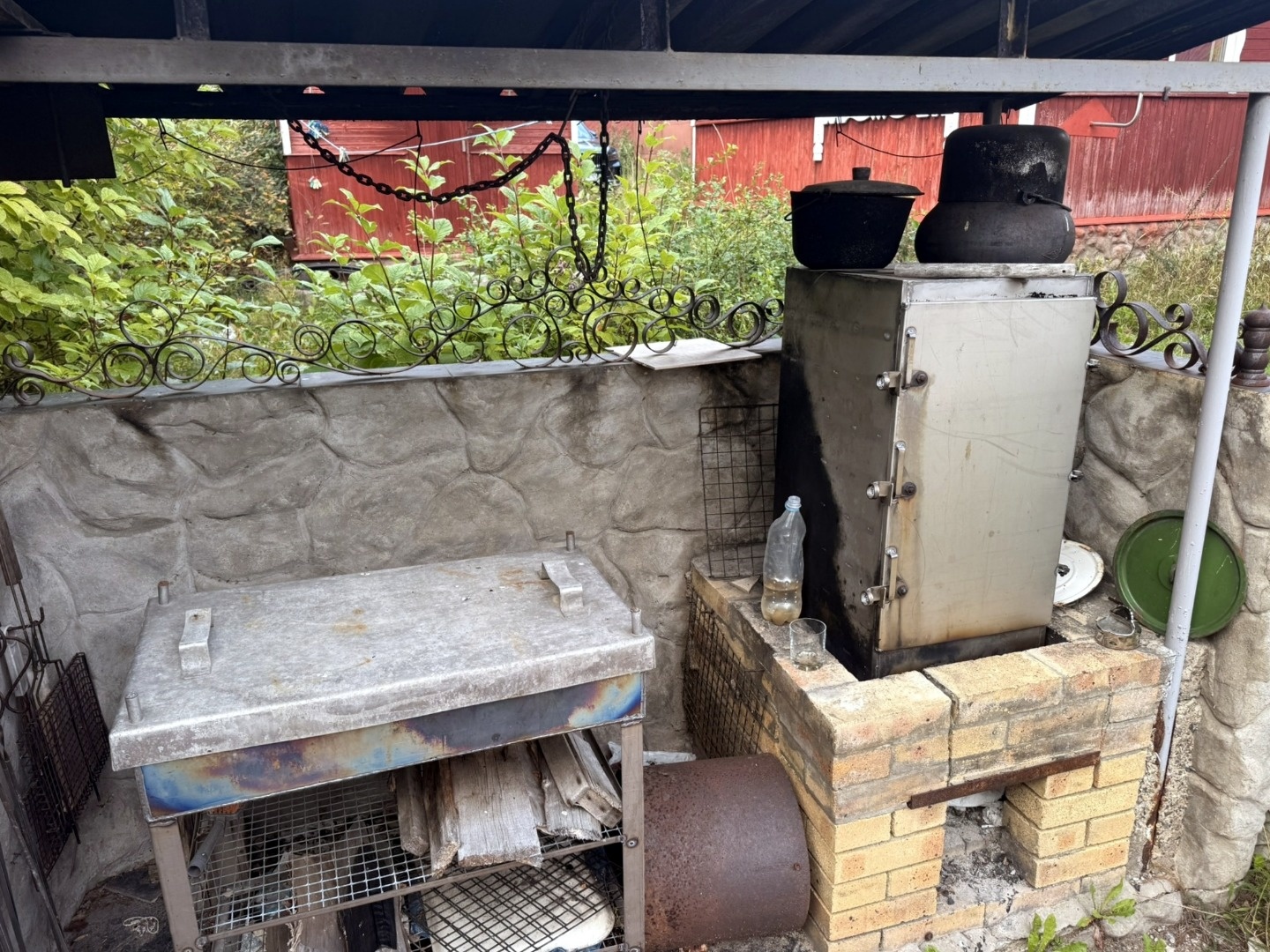 - Зона отдыха: оборудовано место для барбекю с коптильней (холодного и горячего копчения).